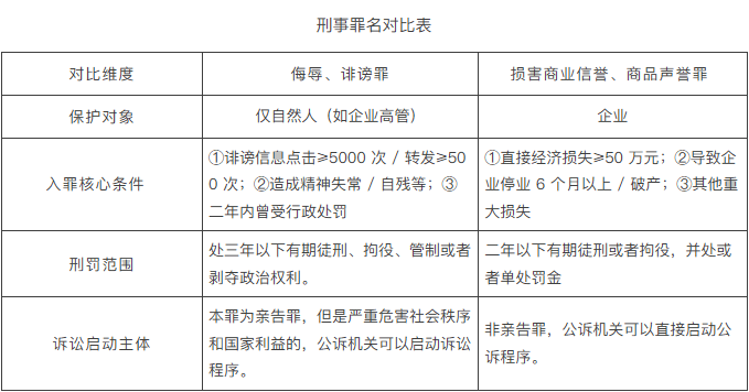 刑事逃责的焦点方针是“逃查侵权人刑事义务,构成”,合用于“侵权情节严沉、形成严沉丧失”的景象,需严酷满脚入罪前提。《中华人平易近国刑法》第二百四十六条:以或者其他方式公开他人或者现实他人,情节严沉的,处三年以下有期徒刑、、管制或者。前款罪,告诉的才处置,可是严沉风险社会次序和国度好处的除外。通过消息收集实施第一款的行为,被害人向告诉,但供给确有坚苦的,能够要求机关供给协帮。本罪位于“人身、罪”一章,仅天然人的人身,不间接企业名望。若舆情针对企业高管小我(如“高管收受行贿”),且满脚“情节严沉”前提,能够逃查者的刑事义务。关于本罪的入罪尺度,根据《最高、最高人平易近查察院关于打点操纵消息收集实施等刑事案件合用法令若干问题的注释》第二条:①统一消息现实被点击、浏览次数达到五千次以上,或者被转发次数达到五百次以上的;②形成被害人或者其近亲属变态、、等严沉后果的;③二年内曾因受过行政惩罚,又他人的;④其他情节严沉的景象。因而,企业或者高管小我正在预备刑事时,需要参考固定电子数据的方式,及时且精确地将固定,以便于后续向法院提告状讼。值得留意的是,本罪为亲陪罪,需要被害者本人向法院提告状讼,可是当、行为“严沉风险社会次序和国度好处”时,可由公诉机关提告状讼。《关于打点操纵消息收集实施等刑事案件合用法令若干问题的注释》中对于“严沉风险社会次序和国度好处”的定义包罗“激发群体性事务的;激发公共次序紊乱的;多人,形成恶劣社会影响的;损害国度抽象,严沉风险国度好处的”,可见两高并没有给出一个量化的法则,这也导致正在司法实践中对于启动公诉法式的尺度也存正在恍惚之处。从司法实践来看,罪的自诉结果并不抱负,正在收集名望侵权案件中,被害人举证的难度大。被害人至多需要就以下现实进行举证:自账号的从体身份是谁?视频/文章点击量几多?能否达到刑事立案尺度?几多人对该视频进行了转发?而对此类电子的取证,需要微信办事供给商协帮查询拜访,没有公机关的协帮和共同,底子无法完成。因而,笔者也企业正在查询拜访的同时,测验考试取机行沟通,证明舆情曾经达到“严沉风险社会次序和国度好处”的法式,请求机关立案侦查,推进本案进度。相关案例:2019 年,湖北籍须眉云某为获取流量收益,正在新浪微博账号 “黑漫趣评” 上多益收集董事长徐波 “醉酒上传不雅观视频大公司群” 等虚假消息,并通过微信群扩散。该谣言导致多益收集股价波动、贸易诺言受损,徐波小我名望严沉贬损。广州市黄埔区审理后认为,云某的行为同时罪取损害贸易诺言罪,最终数罪并罚判处其有期徒刑一年三个月。《中华人平易近国刑法》第二百二十一条,损害贸易诺言、商品声誉罪,是指并现实,损害他人的贸易诺言、商品声誉,给他人形成严沉丧失或者有其他严沉情节的行为,处二年以下有期徒刑或者,并处或者单惩罚金。分歧于平易近事的贸易,本罪的犯罪从体为一般从体,并不要求是运营者,更不要求其取企业存正在合作关系。其次,贸易中的舆情可能是“性消息”,而本罪则明白要求“并现实”,对于舆情的性质要求分歧。最初,就客不雅要件而言,本罪要求居心,贸易则可能由导致。关于本罪的入罪尺度,根据《最高人平易近查察院、关于机关管辖的刑事案件立案逃诉尺度的(二)》第六十六条:①给他人形成间接经济丧失数额正在五十万元以上的;②虽未达到上述数额尺度,但形成公司、企业等单元破产、停产六个月以上,或者破产的;③其他给他人形成严沉丧失或者有其他严沉情节的景象。一般来看,公司一般会按照第一款组织,证明公司蒙受的间接丧失,向机关提起刑事,笔者公司能够汇集舆情发生前后,门店发卖额的变化、商品销量的变化等客不雅,来证明舆情给公司带来的间接丧失。需要时,该当引入第三方律师、会计师事务所供给指点。典型案例:(2021)粤1502刑初181号:被告人江某流因对工做不满,正在“妈妈帮”APP上注册昵称为“垃圾核心”的账号,并于2020年11月1日、2020年11月2日、2020年11月24日多次正在“妈妈帮”APP他人征询汕尾某月子核心环境的帖子中,跟帖“这华恩月子核心仿佛坐月子把婴儿弄死了”“吃月子核心的食物后拉肚子”等虚假言论。最终,法院认为被告人江某流犯损害贸易诺言罪,判处有期徒刑八个月,并惩罚金人平易近币二千元。
